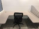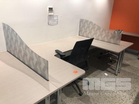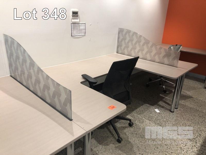 3 x U-SHAPED DESKS, LIGHT BROWN TIMBER LAMINATE, CHROME LEGS, 2060 X 1420mm, 3 x CHAIRS & 2 x GLASS PARTITIONS