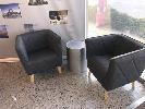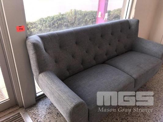 3 SEATER SOFA, GREY FABRIC, 2 x GREY FABRIC VISITORS CHAIRS & 2 x ALUMINIUM ROUND TABLES