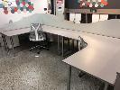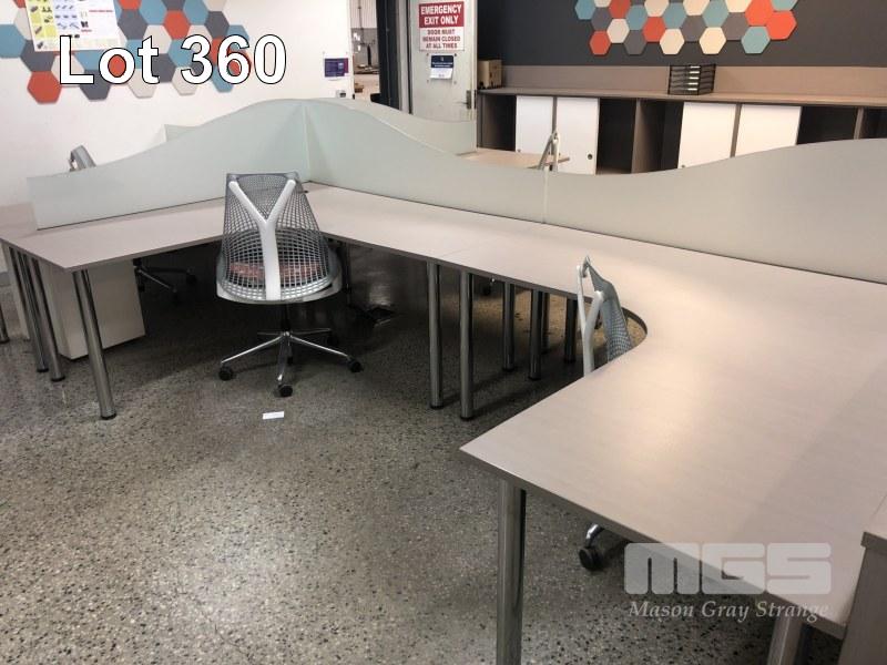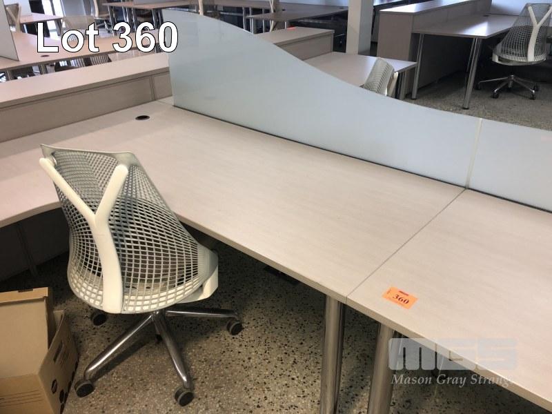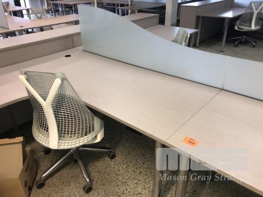 6 PERSON WORK STATION COMPRISING 6 x LIGHT BROWN TIMBER LAMINATE DESKS, 1780 x 1800mm, GLASS PARTITIONS, CHROME LEGS & 6 x CHAIRS