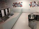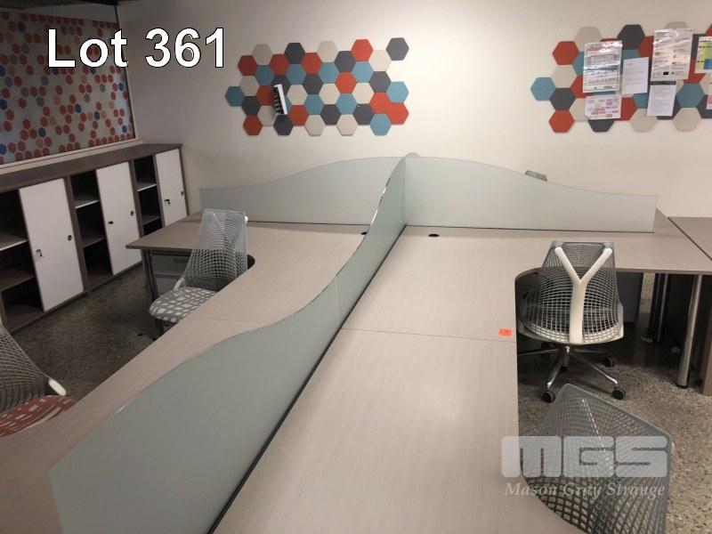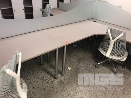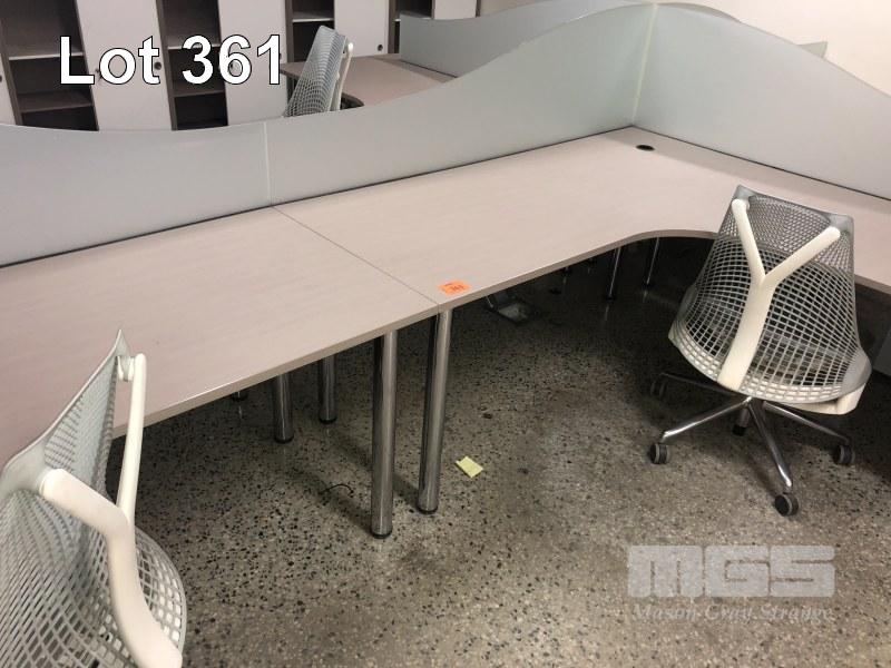 6 PERSON WORK STATION COMPRISING 6 x LIGHT BROWN TIMBER LAMINATE DESKS, 1780 x 1800mm, GLASS PARTITIONS, CHROME LEGS & 6 x CHAIRS