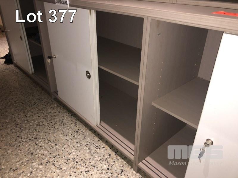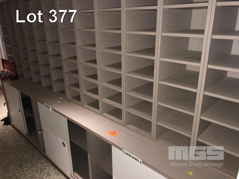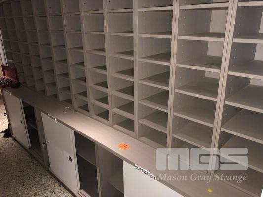 STORAGE CUPBOARD, 6 x DOORS, 3000 x 1800mm (H), MODULAR, LOWLINE, LIGHT BROWN TIMBER LAMINATE & 84 PIGEON HOLE UNIT ON TOP
