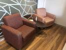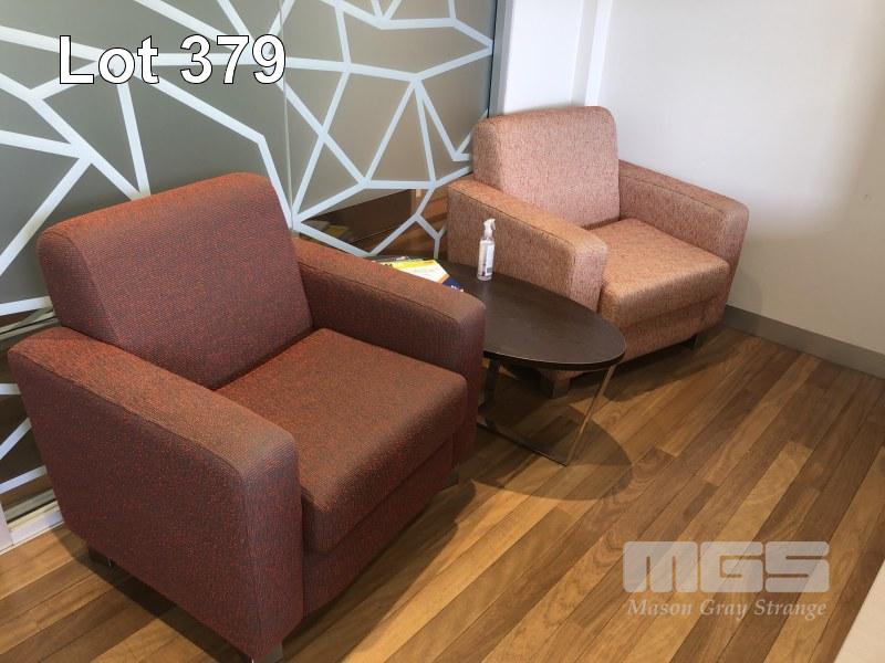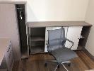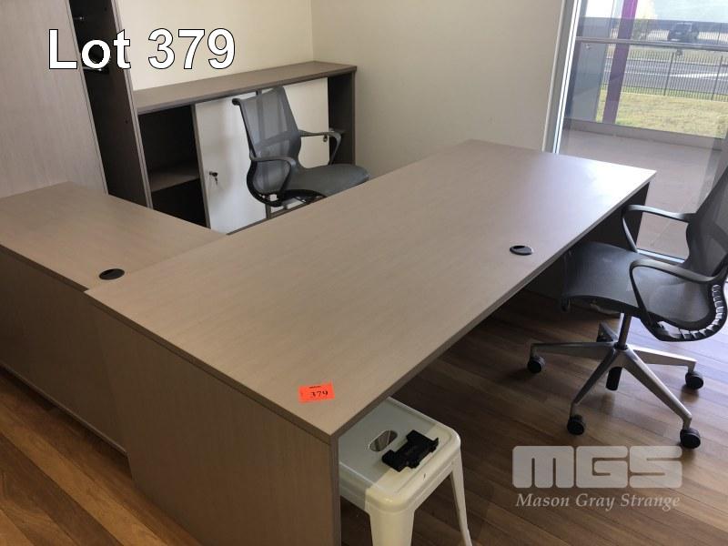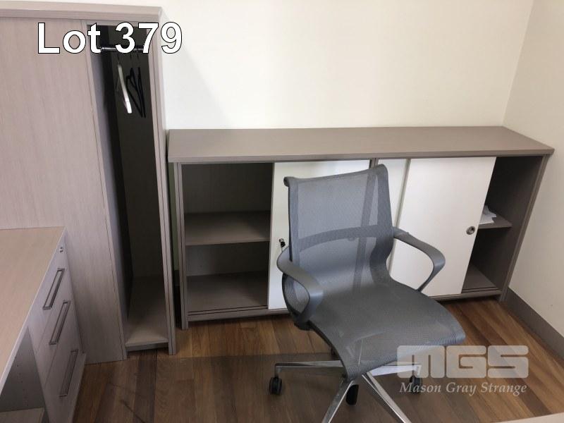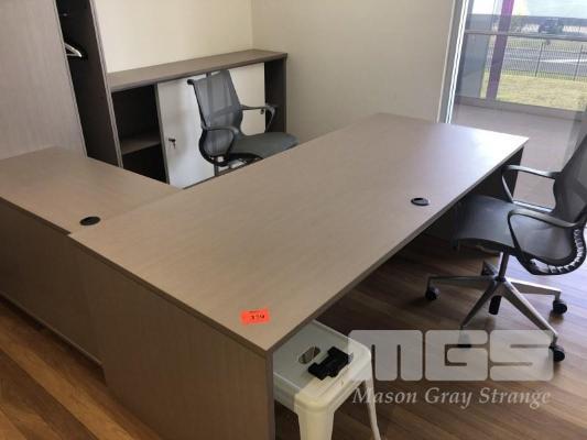 TIMBER LAMINATE DESK, 2100 x 900mm, LIGHT BROWN, MATCHING MOBILE CUPBOARD, 3 x DRAWER, 2 x SHELF, 4 DRAWER FILING CABINET/COAT HANGER & MODULAR CUPBOARD, 4 x SLIDING DOORS, 1810 x 400 x 900mm (H), 2 x GAS LIFT CHAIRS, 2 x VISITORS CHAIRS & COFFEE TABLE