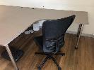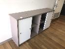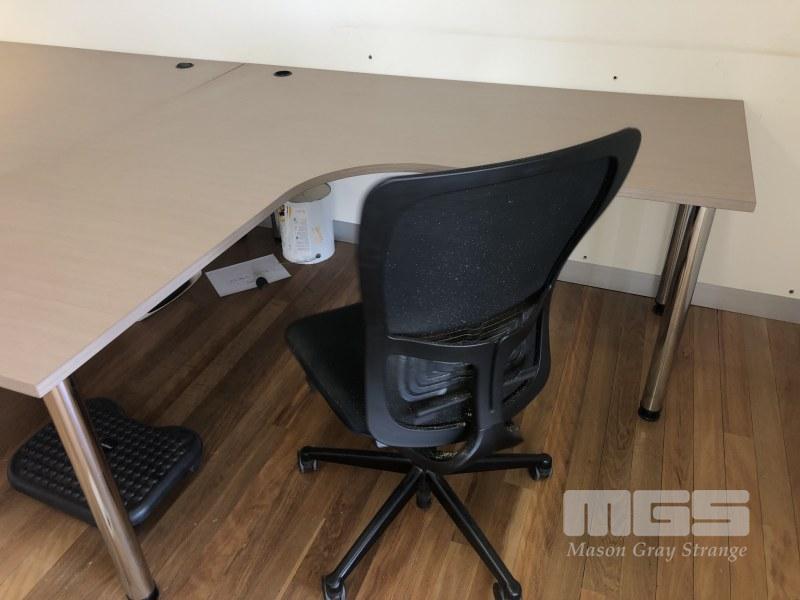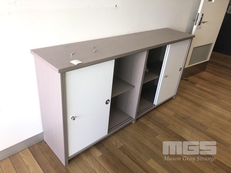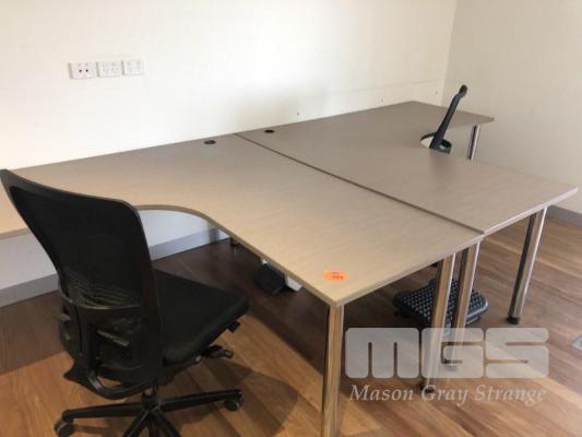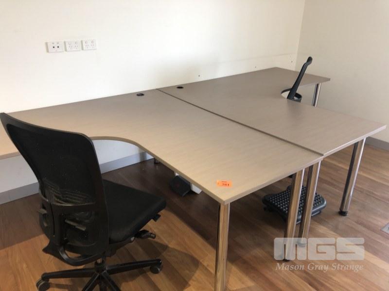 PAIR L-SHAPED LIGHT BROWN TIMBER LAMINATE DESKS, 1800 x 1800mm, MATCHING CABINET, 4 x SLIDING DOORS, 1800 x 900 x 400mm