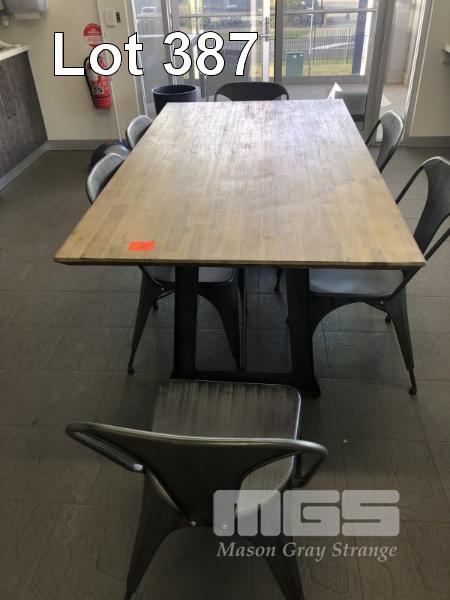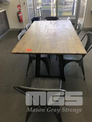 DINING TABLE, TIMBER TOP, STEEL FRAME, 6 x MATCHING CHAIRS & 3 x SILVER METAL STOOLS
