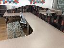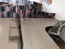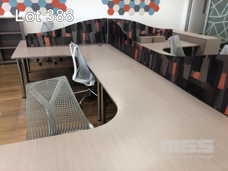 6 PERSON WORK STATION COMPRISING 6 x TIMBER LAMINATE, L-SHAPED DESKS, 1800 x 1800mm, GLASS PARTITIONS, CHROME LEGS & 6 x CHAIRS