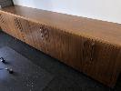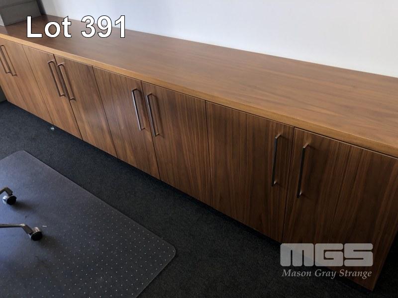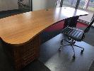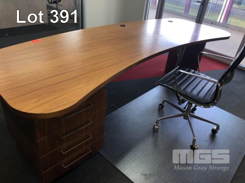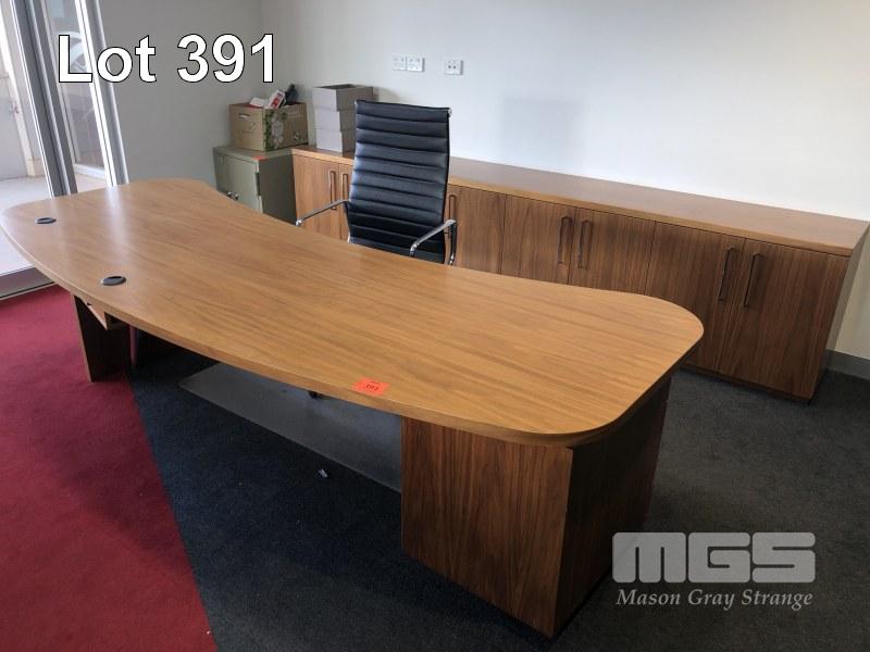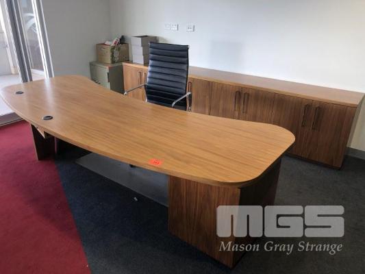 OFFICE DESK,TIMBER LAMINATE, 2600 x 850mm, 4 DRAWER, BLACK LEATHER LOOK GAS LIFT OFFICE CHAIR, CHROME FRAME, MATCHING LOWLINE CUPBOARD, 8 x DOOR, 3000 x 460 x 710mm (H)