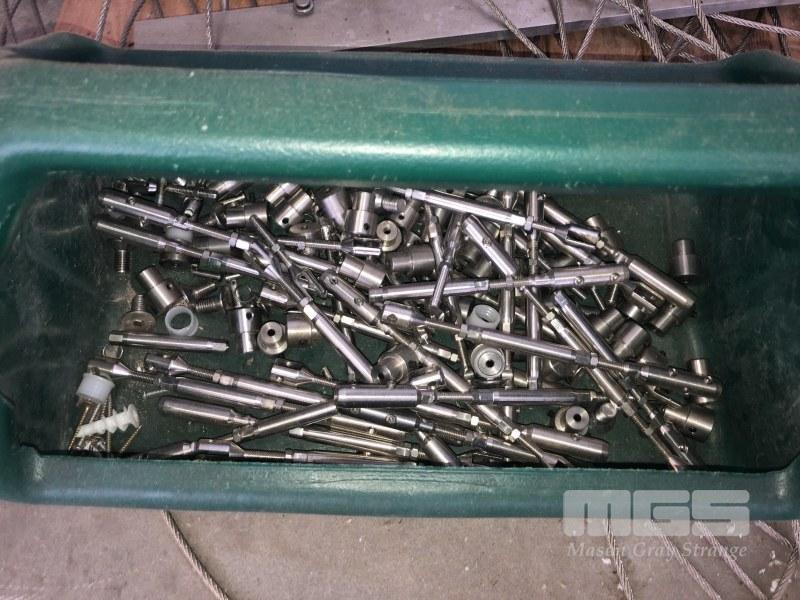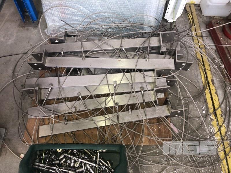 MULTI TIER HANGING GLASS SHELF UNIT, STAINLESS STEEL WIRE ROPE, BRACKETS AND HARDWARE 23 x SHEETS PLATE GLASS SHELVES APPROX 1700 x 600mm LOCATED AT ARTEMITE 28 FULLARTON ROAD NORWOOD