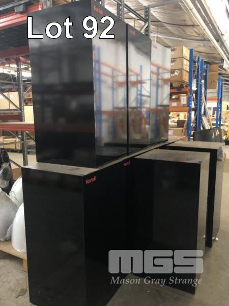 9 x BLACK GLOSS DISPLAY MODULES, 1000m x 500 x 500mm, 3 TIER STAINLESS STEEL DISPLAY RACK, GLASS SHELVES, 1000mm x 300 x 300mm