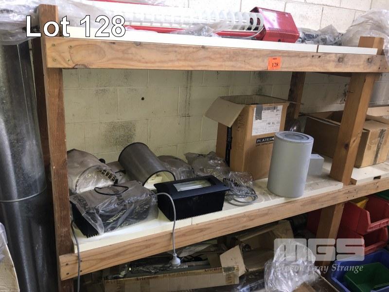 CONTENTS OF TWO SHELVES, ASSORTED FLURO LIGHT FITTINGS, WEATHERPROOF HOUSINGS, INTERNAL FIXTURES, BRANDS INCLUDE PLATEK, ARTEMITE, ZERBETTO LOCATED AT ARTEMITE 28 FULLARTON ROAD NORWOOD