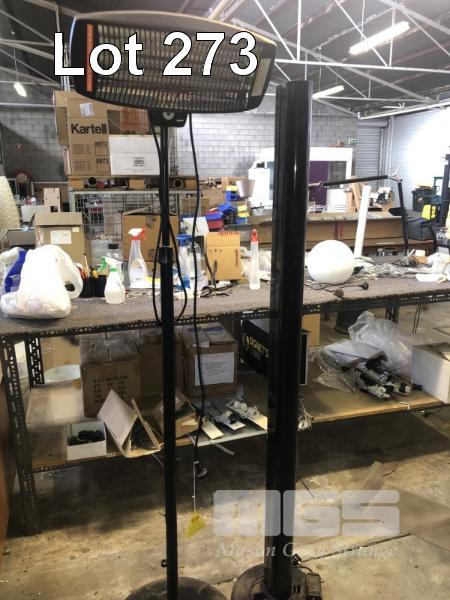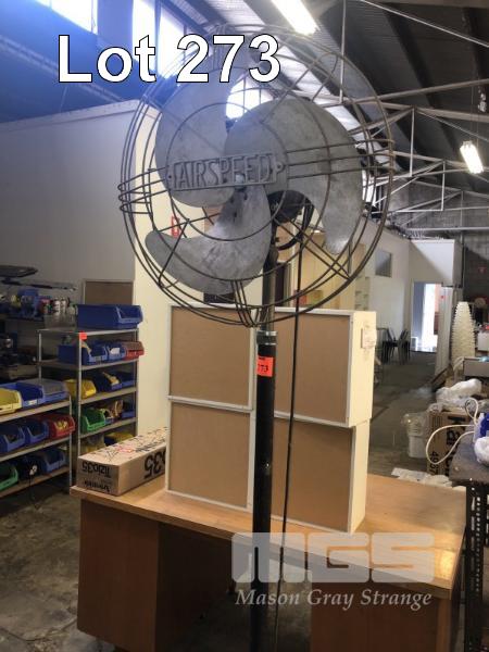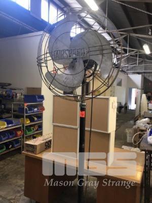 WORK SHOP FAN, VINTAGE, AIR SPEED, 650mm DIAMETER x 2400mm (H) ON HD STEEL STAND WITH PEDASTEL RADIANT HEATER & BLACK ALLOY LIGHT STAND LOCATED AT ARTEMIDE 28 FULLARTON ROAD NORWOOD