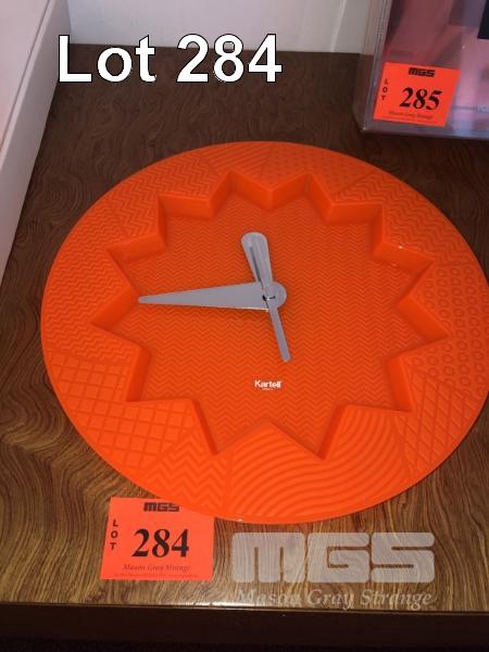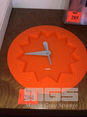 2 x KARTELL CRYSTAL PALACE WALL CLOCK, FLURO ORANGE, 340mm LOCATED AT ARTEMIDE 28 FULLARTON ROAD NORWOOD