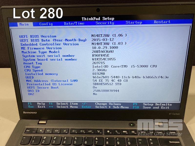 LAPTOP, LENOVO THINKPAD X1 CARBON (20BTA036AU), CORE i5 5300U (5TH GEN) @ 2.3GHz, 8GB DDR3 RAM, 256GB SSD, 14" WIDESCREEN (1920x1080), INTEL HD VIDEO, Wi-Fi, BLUETOOTH, WINDOWS 10 HOME INSTALLED, ONELINK PRO DOCK & POWER SUPPLY S/N:R90FR45E