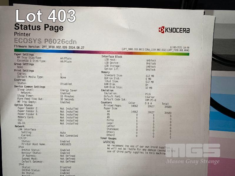 PRINTER, KYOCERA P6026cdn COLOUR LASER, USB, NETWORK, 34,589 PAGES (TEST PAGE ATTACHED) S/N:LW94500562