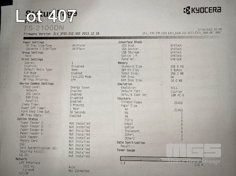 PRINTER, KYOCERA FS-2100DN LASER, USB, NETWORK, 21,463 PAGES (TEST PAGE ATTACHED) S/N:LQB4601303