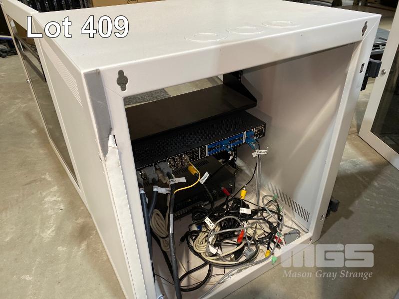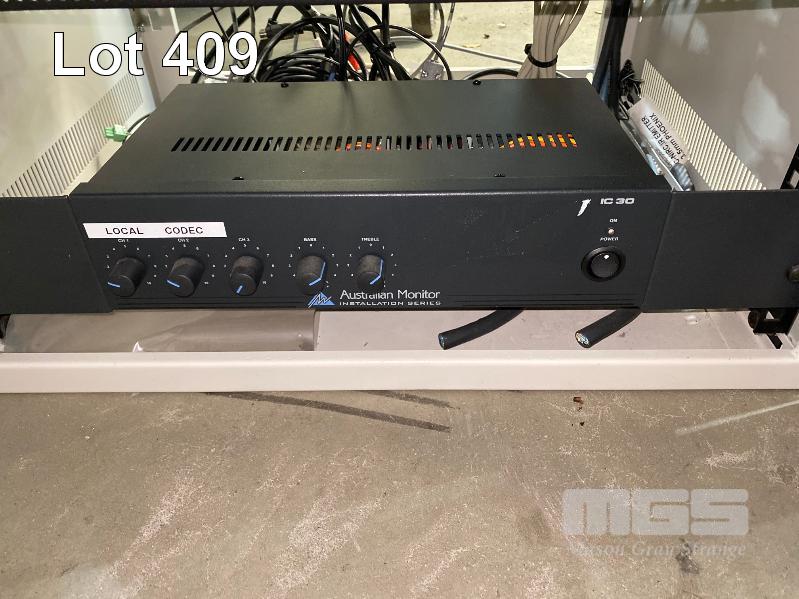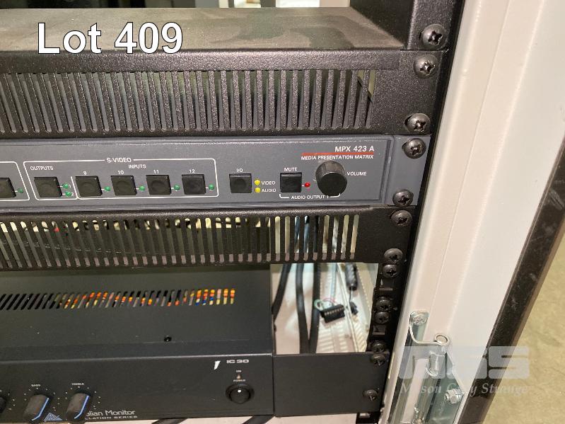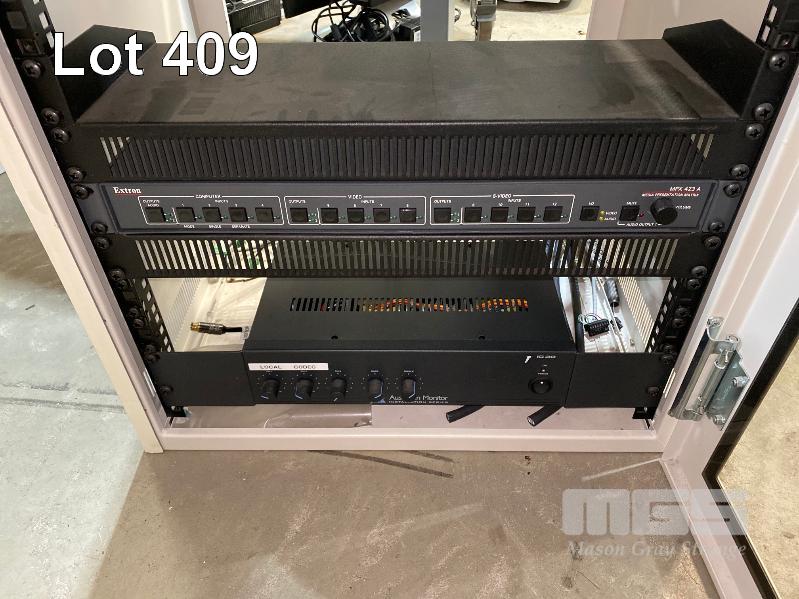 DATA RACK CABINET, 60 (H) x 54 (W) x 47cm (D), LOCKABLE (NO KEYS) WITH EXTRON MPX 423 A MEDIA PRESENTATION MATRIX & AUSTRALIAN MONITOR IC30 AMPLIFIER