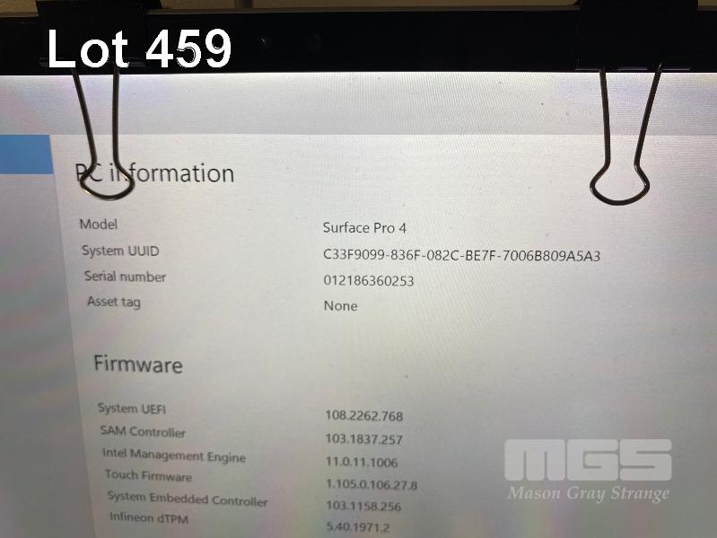 TABLET PC, MICROSOFT SURFACE PRO 4 (NOTE: DAMAGED, BATTERY SWOLLEN, NO POWER SUPPLY) S/N:01218630253