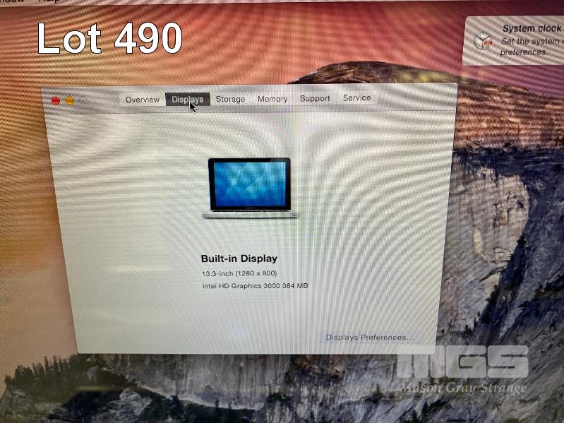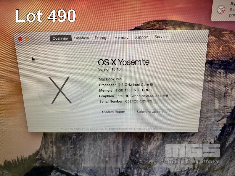 LAPTOP, APPLE MACBOOK PRO (A1278), CORE i5 2415M (2ND GEN) @ 2.3GHz, 4GB DDR3 RAM, 320GB SATA HDD, DVD-RW, 13.3" WIDESCREEN (1280x800), INTEL HD VIDEO, Wi-Fi, MAC OS 10.10 INSTALLED & POWER SUPPLY (NOTE: BATTERY SWOLLEN, NOT CHARGING, MISSING ARROW KEYS, MISSING FEET UNDERNEATH) S/N:C02FQEKJDH2G