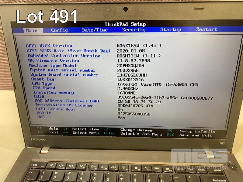 LAPTOP, LENOVO THINKPAD T460 (20FMS0QJ0H), CORE i5 6300U (6TH GEN) @ 2.4GHz, 16GB DDR3 RAM, 256GB SSD, 14" WIDESCREEN (1920x1080), INTEL HD VIDEO, Wi-Fi, BLUETOOTH, WINDOWS 10 PRO INSTALLED & POWER SUPPLY (NOTE: MARKS ON SCREEN) S/N:PC0DSX66