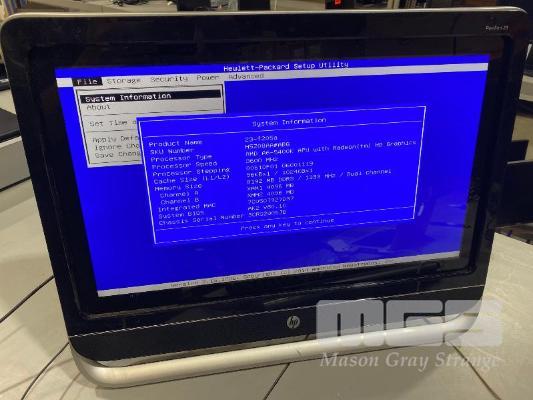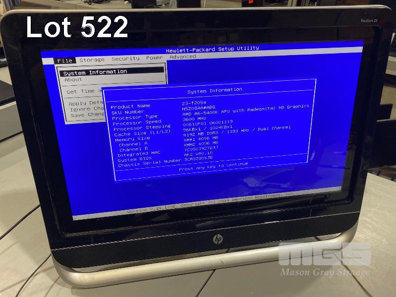 ALL-IN-ONE PC, HP PAVILION 23-f205a, AMD A6-5400K APU WITH RADEON HD GRAPHICS @ 3.6GHz, 8GB DDR3 RAM, 500GB SATA HDD, DVD0RW, BUILT-IN 23" WIDESCREEN, KEYBOARD, MOUSE & POWER SUPPLY (NOTE: HARD DRIVE FAULTY, SCRATCHES ON SCREEN) S/N:3CR32805JB