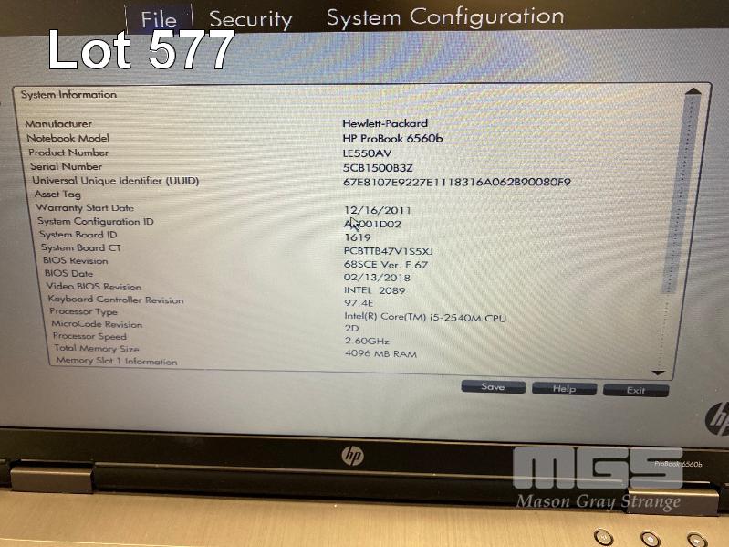 LAPTOP, HP PROBOOK 6560b (LE550AV), CORE i5 2540M (2ND GEN) @ 2.6GHz, 4GB DDR3 RAM, 250GB SATA HDD, DVD-RW, 15.6" WIDESCREEN (1366x768), INTEL HD VIDEO, Wi-Fi, BLUETOOTH, WINDOWS 7 PRO INSTALLED W/ LICENSE & POWER SUPPLY S/N:5CB1500B3Z