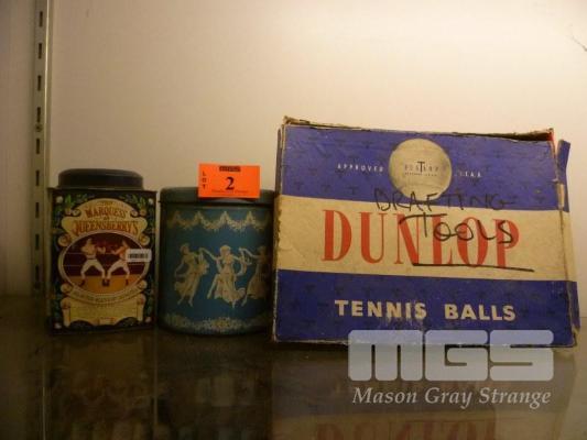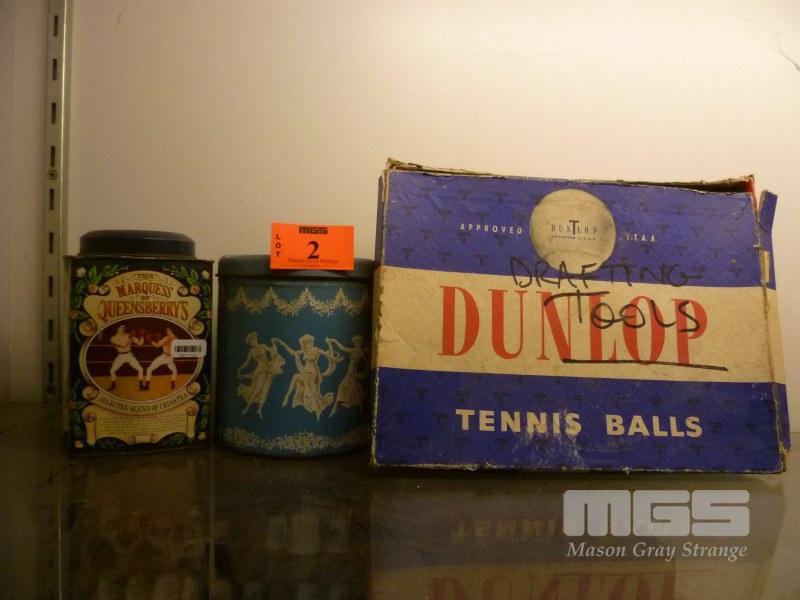 ASSORTED TINS, INC WEDGEWOOD, THE MARQUESS OF QUEENSBERRY, DUNLOP TENNIS BALLS CARDBOARD BOX, ETC