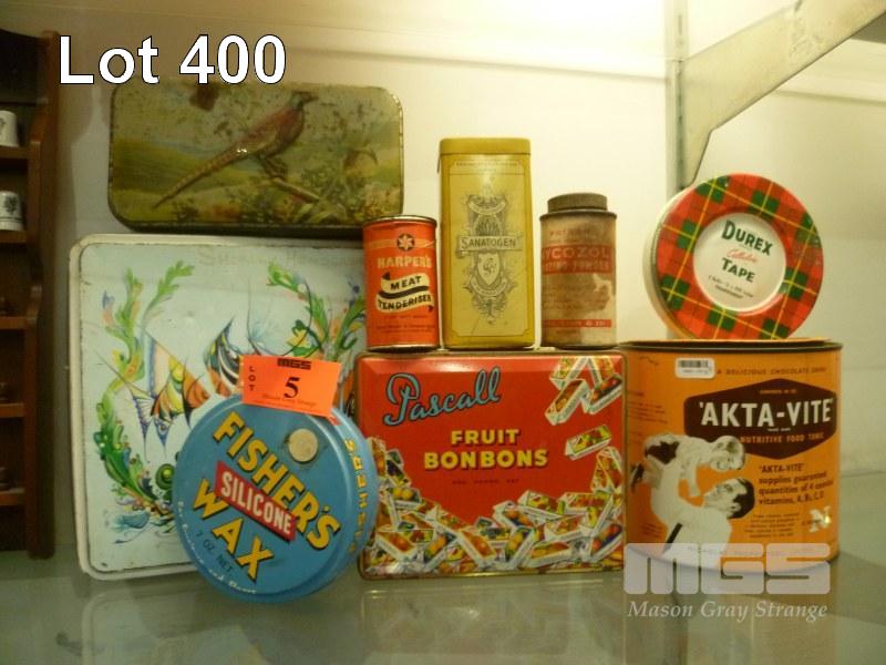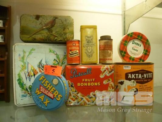 9 x VINTAGE ADVERTISING TINS INC PASCALLS, FISHERS WAX & AKTA-VITE