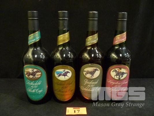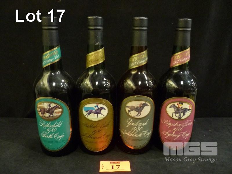 4 X BOTTLES OF ST HALLETT'S 1977 VINTAGE PORT, INC; 1980 PERTH CUP, ADELAIDE CUP, MELBOURNE CUP, SYDNEY CUP
