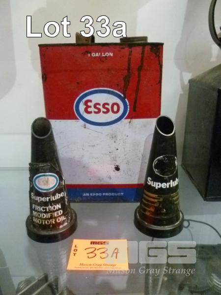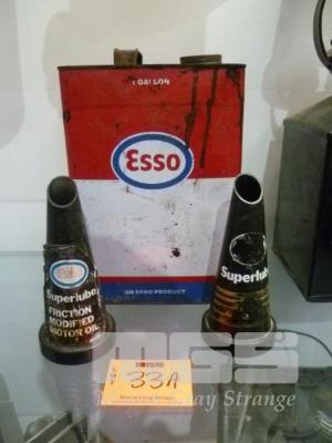 3 x ESSO ITEMS, INC, 1 GALLON OIL TIN, SMALL HOLES TO BODY, SOLIDIFIED OIL WITHIN & 2 x ESSO SUPERLUBE PLASTIC TOPS