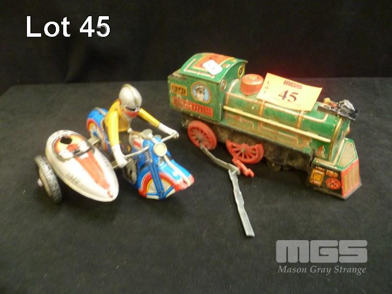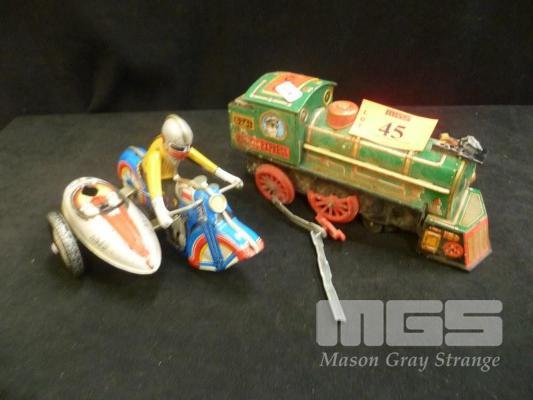 TIN TOY TRAIN & WIND UP MOTORCYCLE, ALL FAULTS