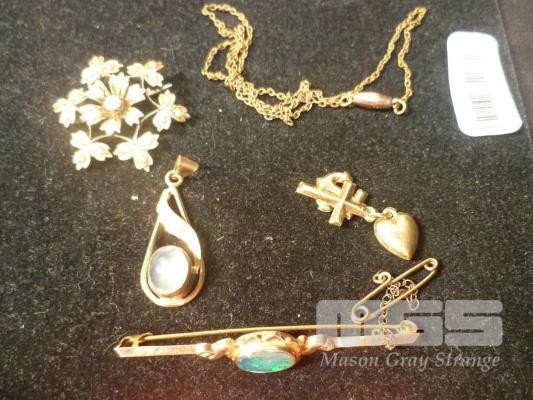 5 X PIECES OF GOLD JEWELLERY, MARKED 9CT, INCLUDING; ROSE GOLD NECKLACE, 1.14grams GOLD BROOCH SET WITH OPAL, 2.3grams GOLD FLOWER BROOCH, 3.34grams GOLD PENDANT SET WITH MOONSTONE, 1.58grams LINKED GOLD PENDANT, ANCHOR/HEART/CRUCIFIX, 0.98grams (ONLY CRUCIFIX MARKED)