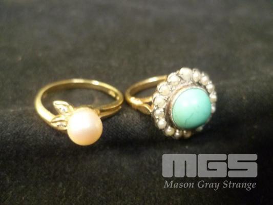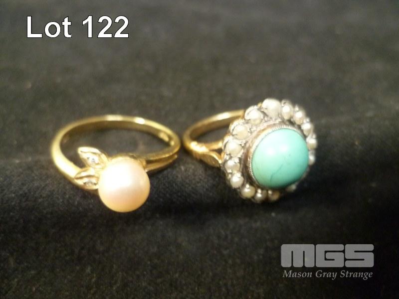 2 X GOLD RINGS, INC; GOLD RING SET WITH PEARL & 2 X SMALL CLEAR STONES, MARKED 18K, SIZE 6.25, 2.44 grams GOLD RING SET WITH TURQUOISE & SMALL PEARLS, MARKED 18CT, SIZE 4.75, 3.97 grams