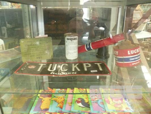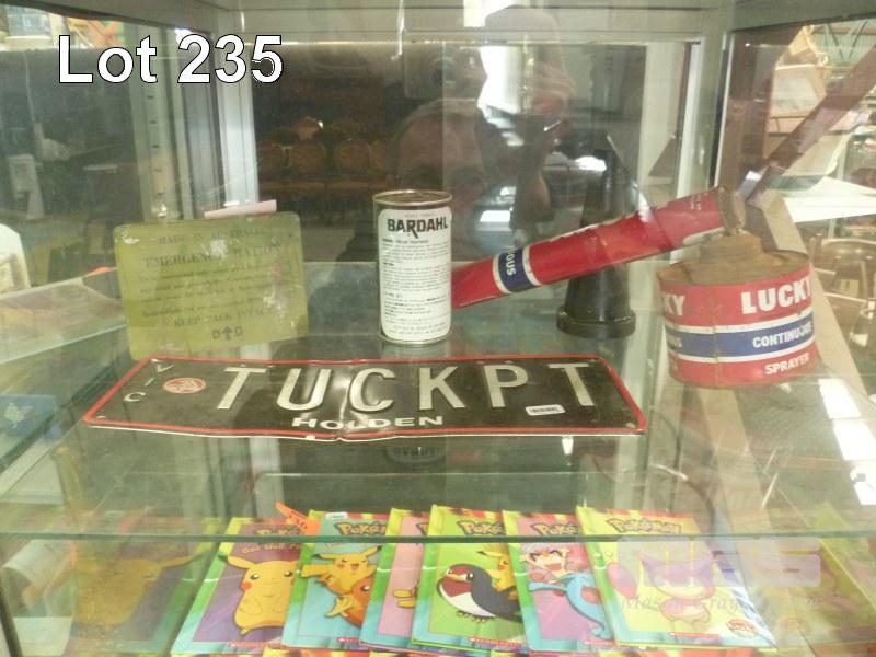 ASSORTED COLLECTABLES INC 1 x VIC HOLDEN NUMBER PLATE, TUCKPT, LUCK CONTINUOUS BUG SPRAYER, BARDAHL ENGINE TREATMENT (NOS) & EARLY AUSTRALIAN EMERGENCY RATION TIN & BLACK POURER