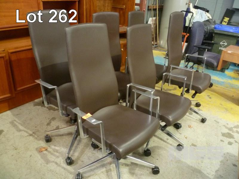 SET OF 6 DESIGNER FIXED HIGH BACK EXECUTIVE MUGA 2 CHAIRS, DESIGNED BY JORGE PENSI FOR AKABA FURNITURE, FULLY UPHOLSTERED LEATHER, POLISHED ALUMINIUM ARMRESTS, SYNCHRO 11 POSITION MECHANISM WITH ADJUSTABLE HEIGHT SEAT, CASTOR AUTO BRAKING (RRP PER CHAIR $2,500)