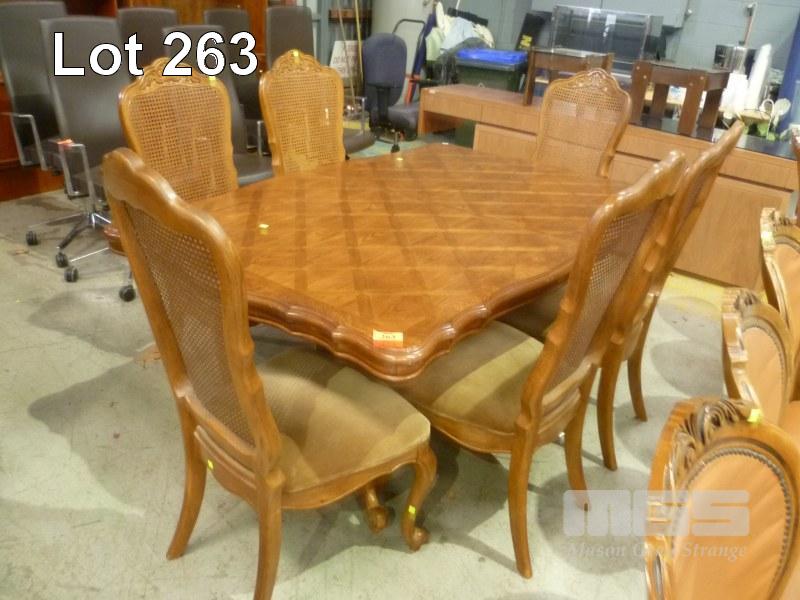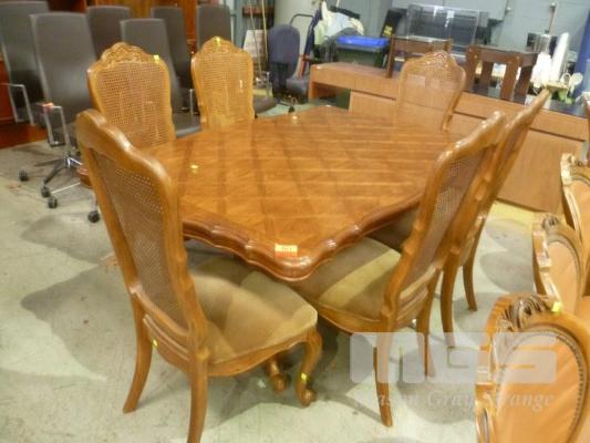 MANCHURIAN OAK VENEER 7 PIECE DINING SUITE INC RECTANGULAR EXTENSION TABLE, MARQUETRY INLAY TOP, DUAL PEDESTAL WITH 6 x HIGH BACK DINING CHAIRS, VELVET SEAT, WOVEN CANE BACK INC CARVER CHAIR