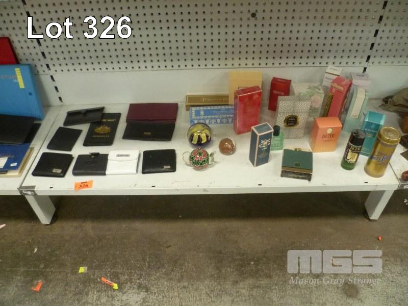 ASSORTED LEATHER WALLETS, PAPER WEIGHTS, PERFUMES & AFTERSHAVES INC COLOGNE, DUNE, LES FLEURS, ELIZABETH ARDEN & MORE