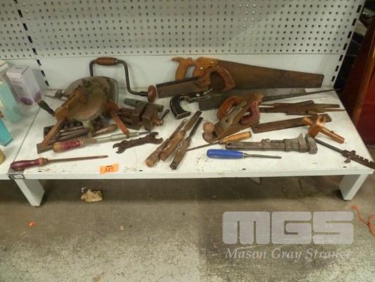 VINTAGE CARPENTERS TOOLS, PLANE, CHISELS, SAWS, DRILL, SAW SET, SCRIBE, GRINDING WHEEL, ETC