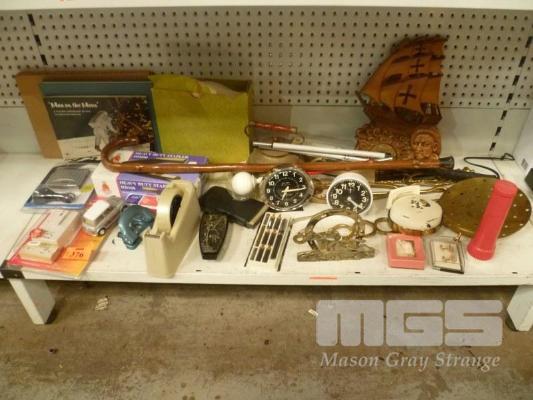 ASSORTED BRASSWARE, CLOCKS, OFFICE STATIONERY, ETC