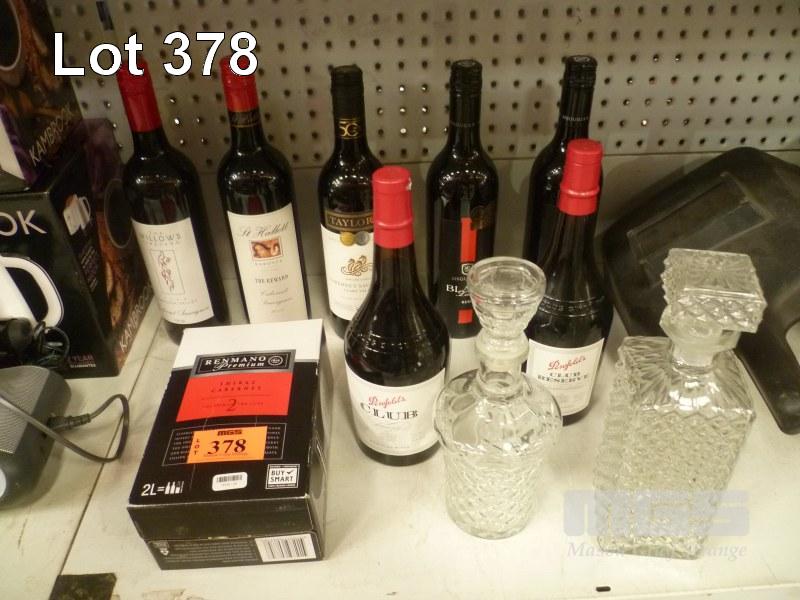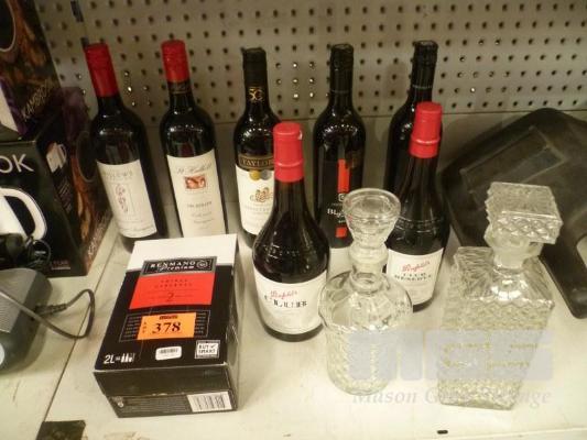2 x BOTTLES PENFOLDS TAWNY, CASK OF SHIRAZ & 2 x DECANTERS RED WINE