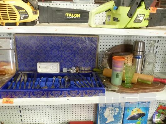 BOXED CUTLERY SET & ASSORTED KITCHENWARE INC ANODIZED CUPS