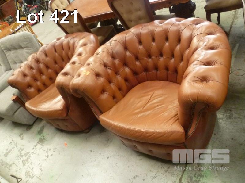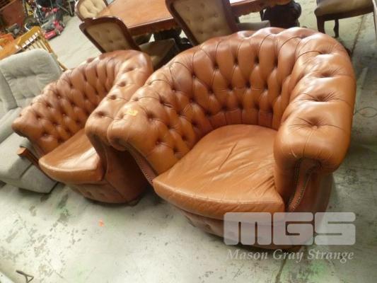 PAIR CHESTERFIELD ARM CHAIRS, BROWN LEATHER, DEEP BUTTON, ROLL ARM (WORN ARM REST & CUSHIONS)