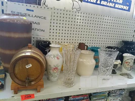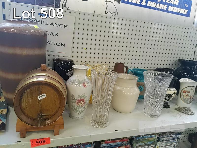 ASSORTED VASES & SMALL PORT BARRELL