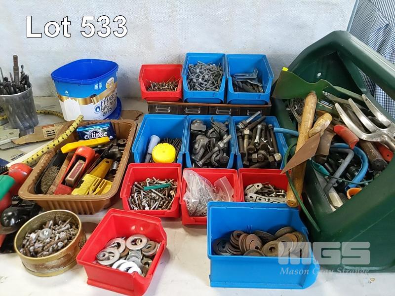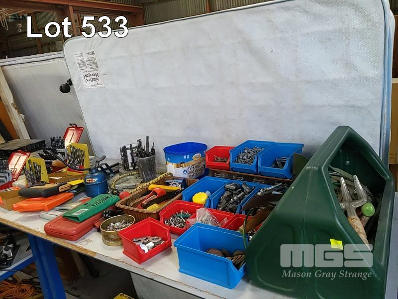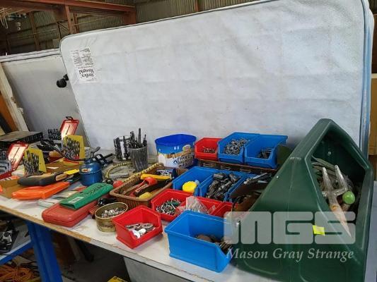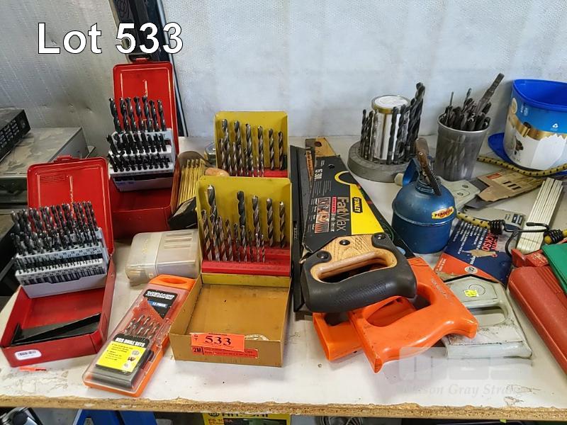 ASSORTED DRILL BITS, HAND TOOLS, FITTINGS, ETC