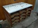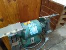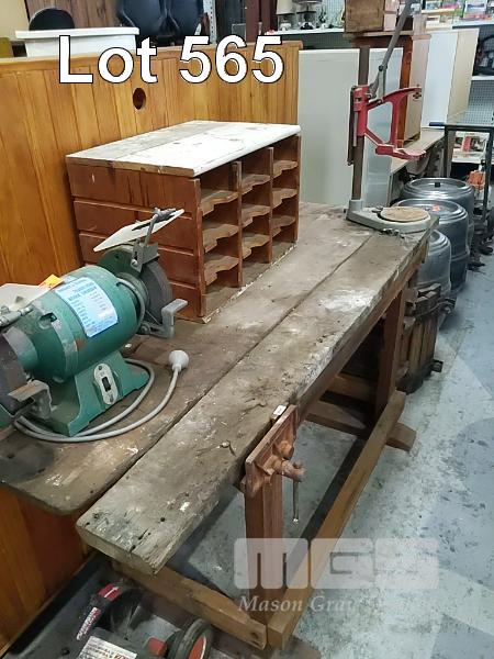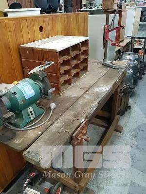 VINTAGE WORK BENCH WTH VICE, GRINDER, SHELF UNIT, ETC