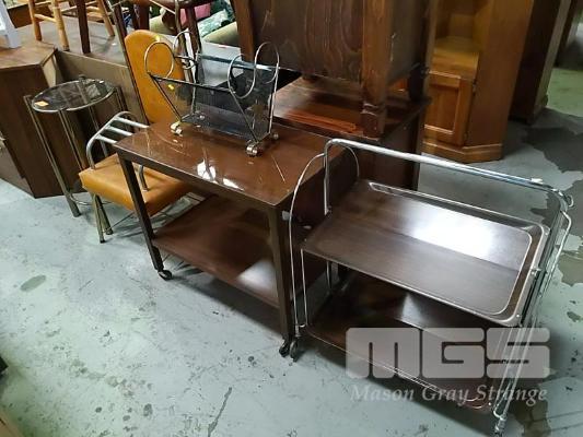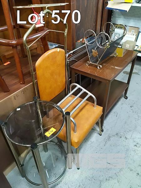METAL MAGAZINE RACK, TIMBER TRAYMOBILE, GLASS TOP, FOLD UP METAL TRAYMOBILE, ROUND 2 TEIR SIDE TABLE, METAL FOOT REST & GENTLEMENS VALET