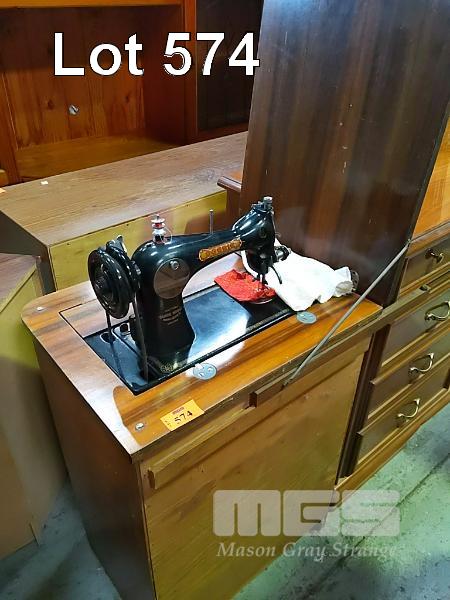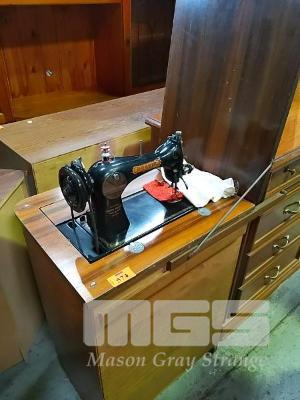 VINTAGE DOBBIE CENTRAL BOBBIN SEWING MACHINE IN TIMBER CABINET WITH CAST IRON PEDAL