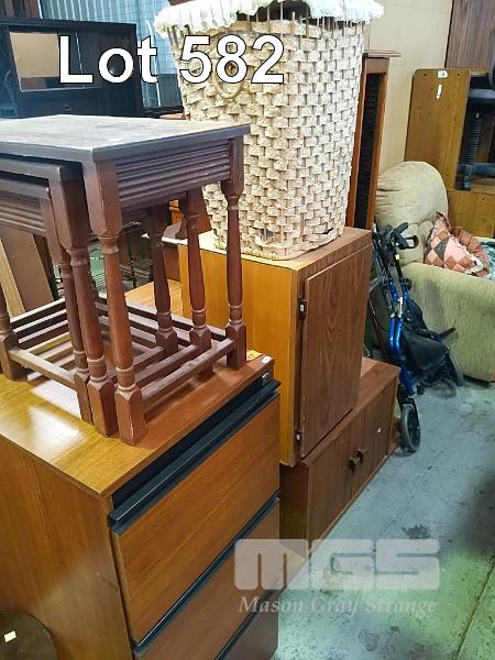 TIMBER VENEER ENTERTAINMENT UNIT, 3 DRAWER FILING CABINET, NEST 3 TABLES, CD TOWER, SINGLE DOOR CABINET & LAUNDRY BASKET