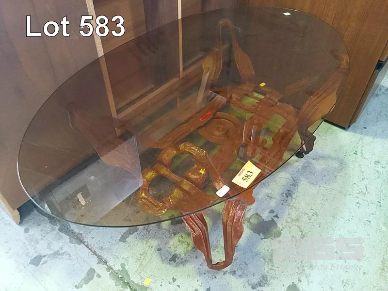 OVAL COFFEE TABLE, MODERN METAL BASE, SMOKE GLASS TOP