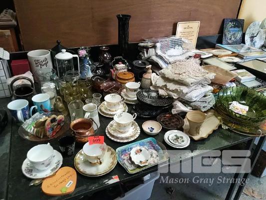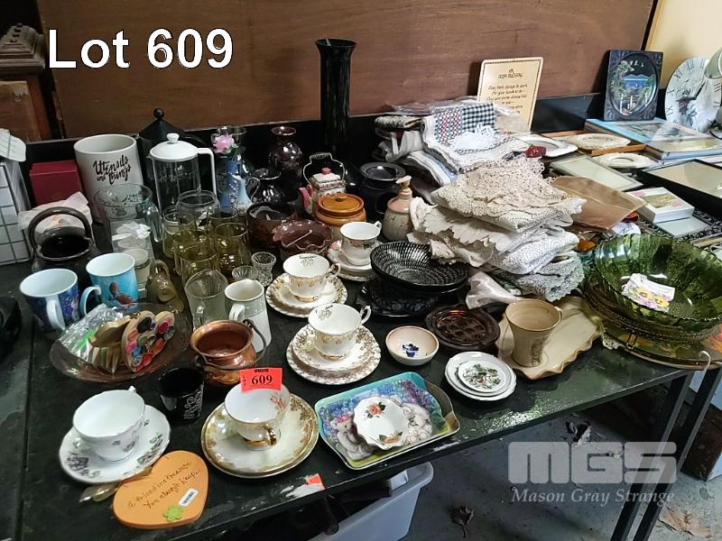ASSORTED TEA TOWELS, DOILIES, TRIOS, VASES, ETC, 1 x TABLE
