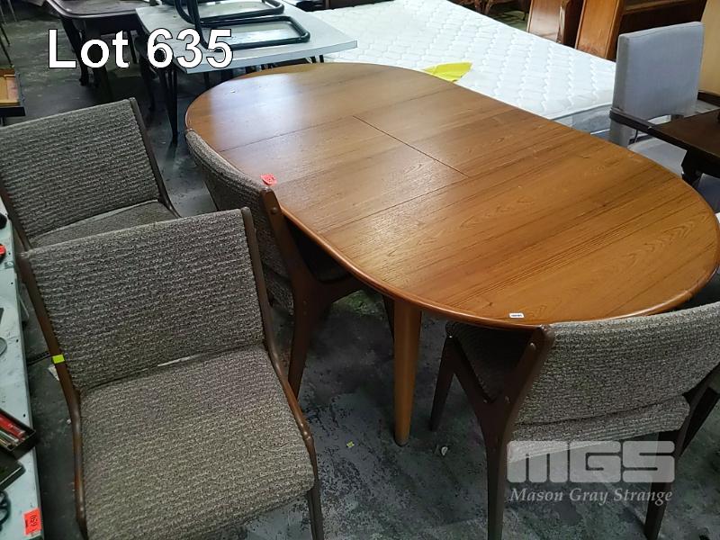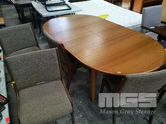 NOBLETT 5 PIECE DINING SUITE INC TEAK OVAL EXTENSION TABLE & 4 x BEIGE FABRIC, TEAK CHAIRS