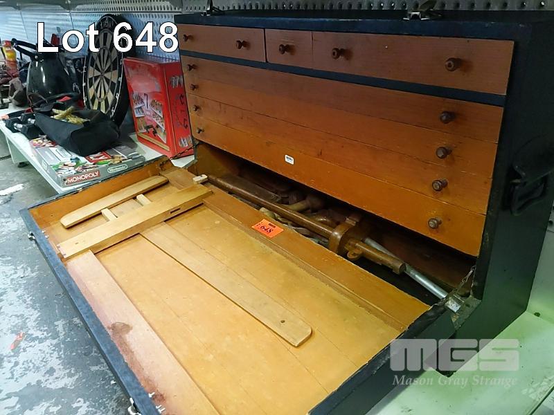 CARPENTERS TOOLS IN ANTIQUE DROP FRONT 7 DRAWER TOOL BOX